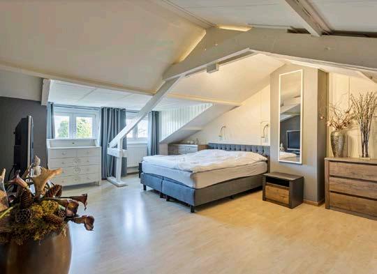 Hier is een grote slaapkamer aanwezig, onder de schuine daken van het huis. De slaapkamer biedt voldoende ruimte voor een groot bed en kastruimte.