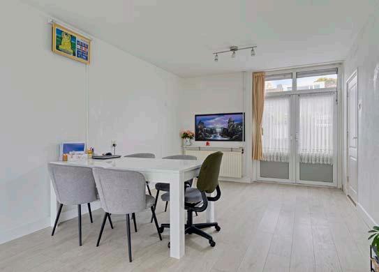Binnen opent zich een fijne, lichte woonkamer met zicht op de zonnige achtertuin, die dankzij de zuidwestelijke ligging nagenoeg de hele dag beschikt over zonlicht.
