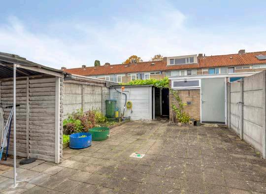 En dan de buitenruimte: een ruime achtertuin, beschut, groen en heerlijk op de zon gericht. Met een stenen berging voorzien van elektra en een achterom, is dit een tuin die leeft en werkt – precies wat je nodig hebt.