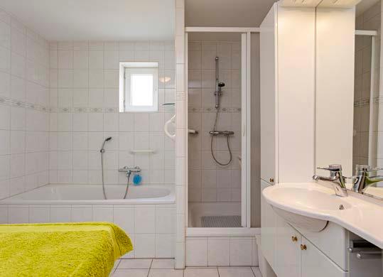 De badkamer biedt met zijn wastafelmeubel met opbergruimte, aparte douchecabine, ligbad en aansluiting voor de wasapparatuur alle gewenste voorzieningen.