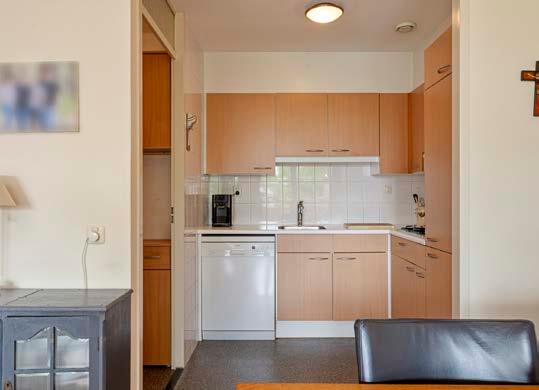 De half open keuken in hoekopstelling is uitgerust met een gasfornuis en afzuigkap. Met de mogelijkheid om diverse losse apparatuur toe te voegen, kun je de keuken eenvoudig uitbreiden naar jouw persoonlijke wensen en behoeften. Grenzend aan de keuken bevindt zich nog een uitermate handige berging/bijkeuken met hier tevens de cv-opstelling.