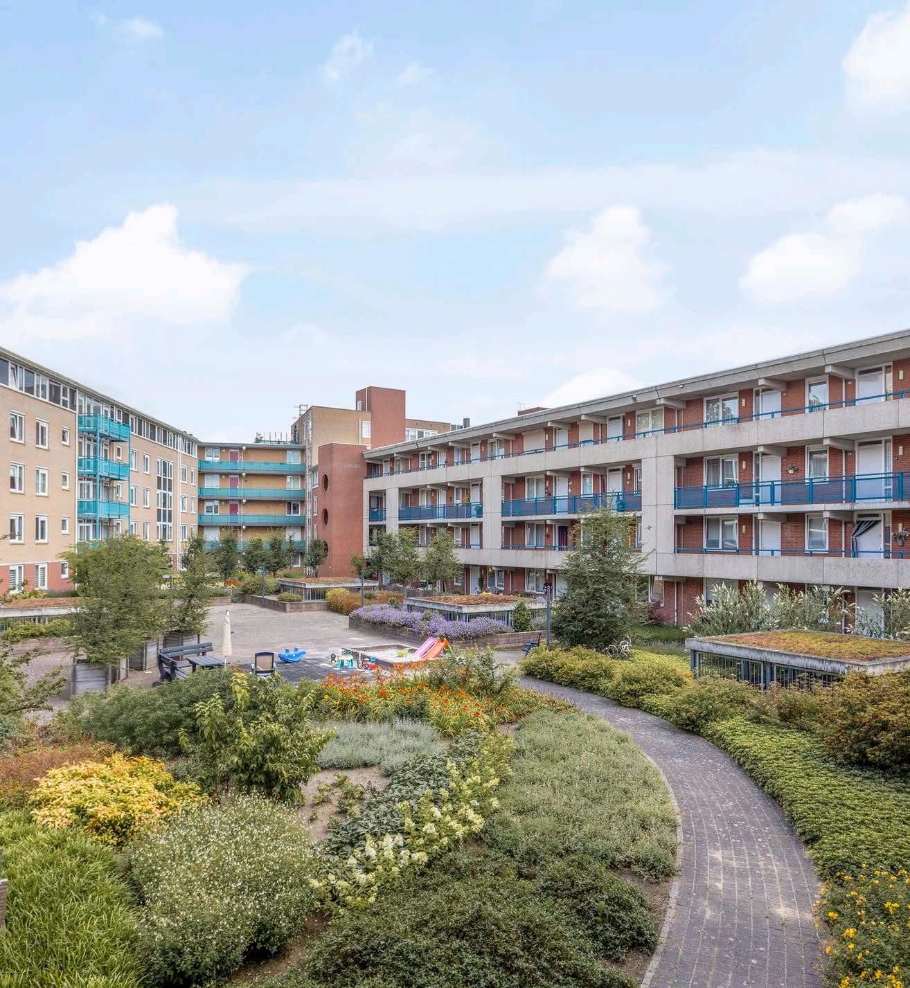 Naast het eigen balkon, beschikt het appartementencomplex ook over een gezamenlijke binnentuin, een heerlijke plek om te genieten van het buitenleven zonder het gedoe van onderhoud. Deze tuin is goed onderhouden en biedt een oase van rust te midden van de drukte van de stad.