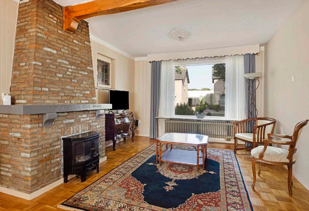 De woning aan de Boshoverbeek biedt een ruime zonnige woonkamer met sfeervolle elektrische haard, een half open keuken met gaskookplaat, afzuiging en koelkast, en toegang tot de handige bijkeuken en aangebouwde eetkamer.