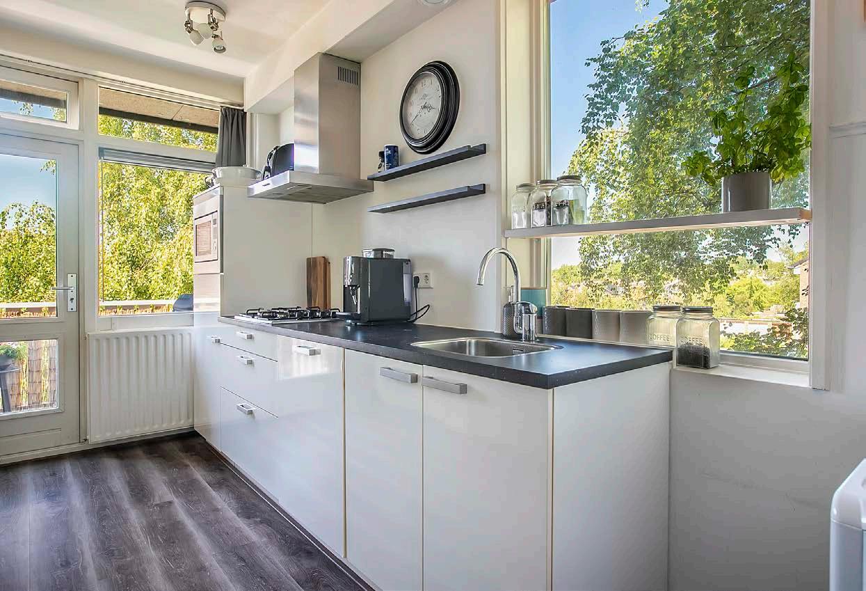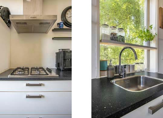 En nu door naar de keuken! Vanuit de woonkamer loop je naar de keuken. Hier vind je alles wat je nodig hebt: een 4-pits gaskookplaat, combi-oven, koelkast met vriesvak en een vaatwasser. De CV is netjes weggewerkt in een kast en er is ook plaats voor je wasmachine in de keuken.