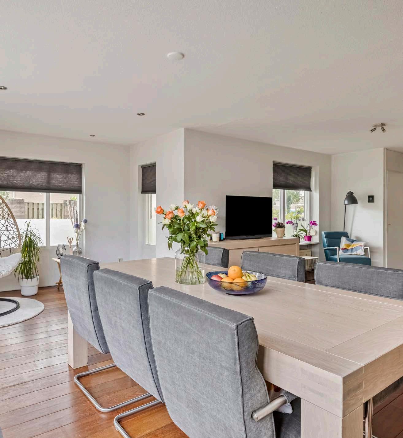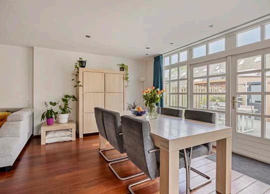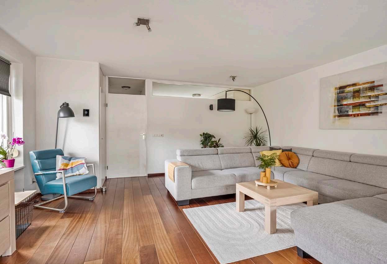 Stap binnen in de ruime en uitnodigende woonkamer, waar licht en ruimte hand in hand gaan. Zijramen zorgen voor een overvloed aan natuurlijk licht, terwijl de openslaande deuren naar de tuin een naadloze overgang tussen binnen en buiten bieden. Hier kun je ontspannen met een goed boek, gezellige avonden doorbrengen met vrienden of genieten van een rustige ochtend met een kopje koffie. De woonkamer - met een massief houten Jacoba vloer- is het hart van het huis, een plek waar je je direct thuis voelt en die uitnodigt tot zowel ontspanning als gezelligheid.