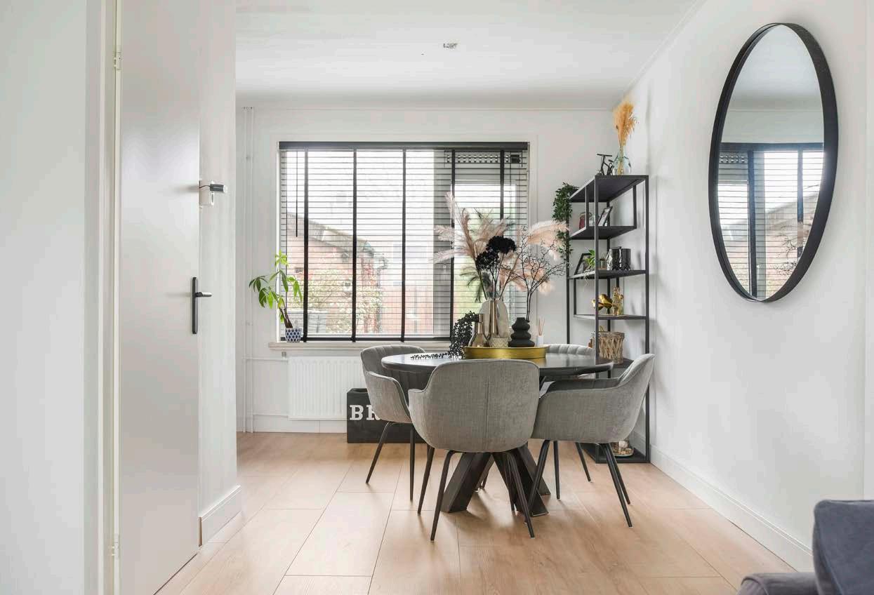 De woonkamer is ruim opgezet met aan de voorzijde ruimte voor een zitgedeelte en aan de achterzijde alle ruimte voor een eettafel, zodat je tijdens het eten leuk wegkijkt naar de diepe tuin. Wanneer de zon schijnt zet jij de deur open en ontstaat er een naadloze verbinding met de tuin. Tot slot is de gehele begane grond afgewerkt met een laminaat vloer en een combinatie van een strakke wandafwerking.