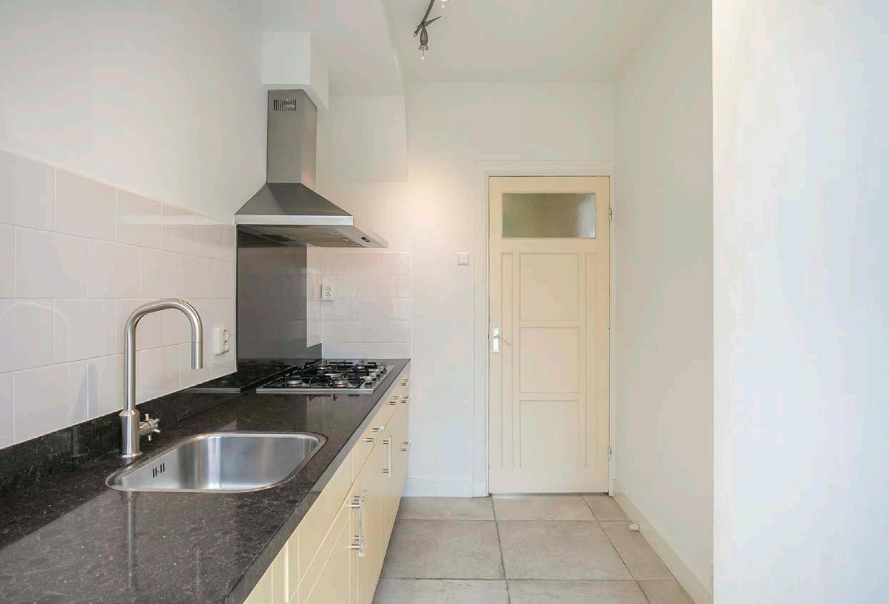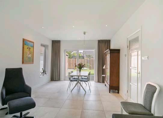 De ruime woonkamer is keurig afgewerkt met een plavuizenvloer met vloerverwarming, inbouwspots en stucwerk op de wanden. Het daglicht komt hier aangenaam naar binnen dankzij de erker en openslaande deur die toegang verleent tot de tuin. Ook is hier de charme van de jaren ‘20 te herkennen aan de erker en de paneeldeuren. Wanneer je een comfortabele zit-en eethoek plaatst zul je hier al snel het warme gevoel van thuis ervaren.