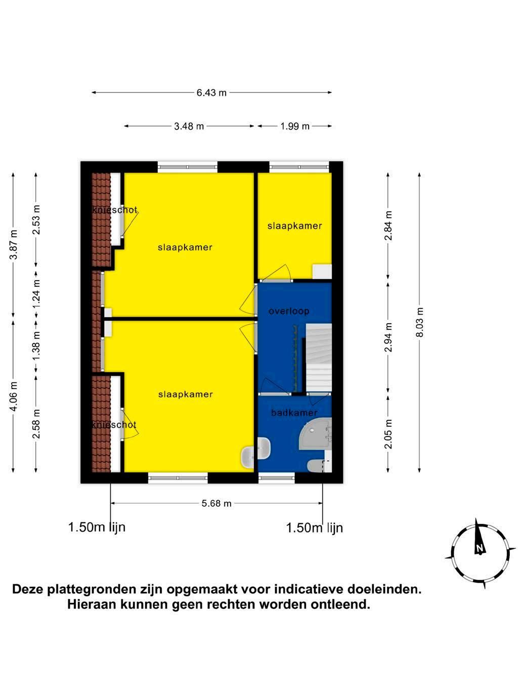 Via de trapopgang komen we op de overloop van de eerste verdieping terecht. Hier tref je de badkamer en drie slaapkamers aan. De badkamer is voorzien van een toilet, wastafelmeubel en douchebak, waardoor je van alle gemakken voorzien bent. Daarnaast kun je de ruimte natuurlijk ventileren dankzij het raam.