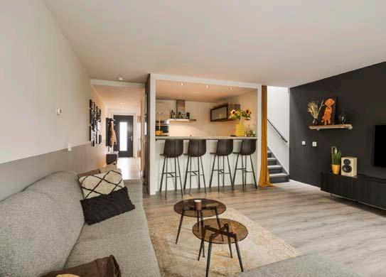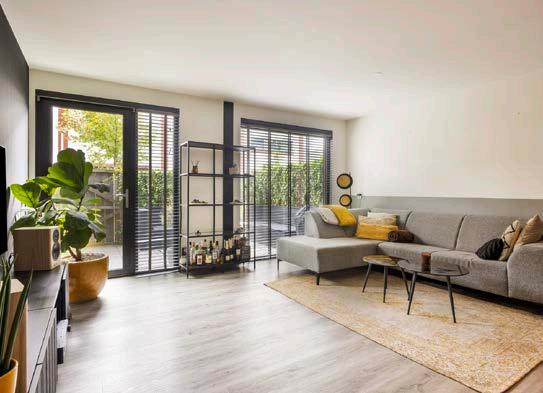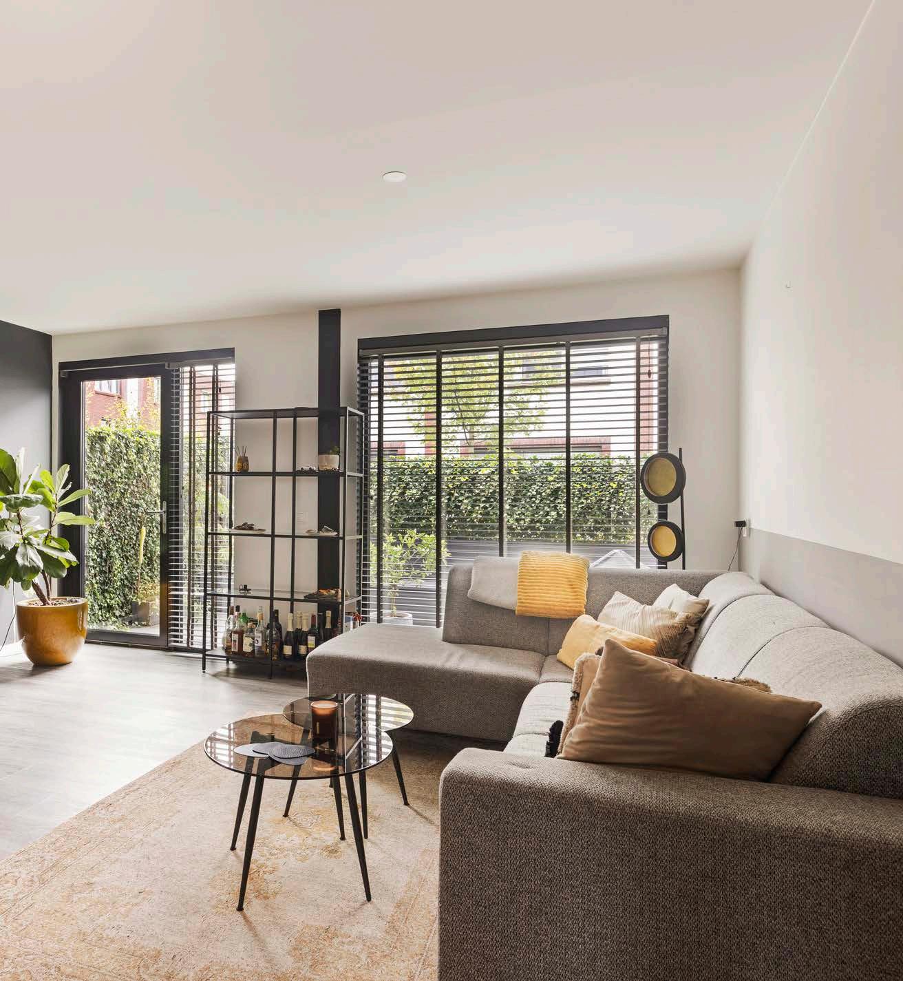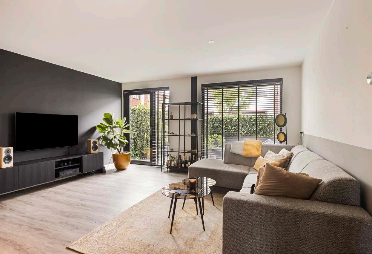 De woonkamer is een sfeervolle ruimte en door de openslaande deuren heeft u direct toegang tot het zonneterras. De hoge plafonds en de grote ramen zorgen voor veel licht en ruimte.