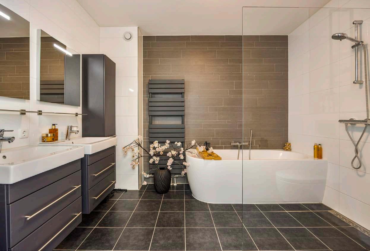De badkamer is erg netjes en voorzien van een inloopdouche, ligbad, toilet en dubbele wastafel met meubel.