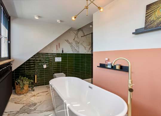 Daarnaast beschikt deze woning over een luxe en stijlvolle badkamer op de eerste verdieping, met een ligbad, douche, dubbele wastafel en toilet. De wanden zijn deels afgewerkt met prachtige tegels in marmerlook.