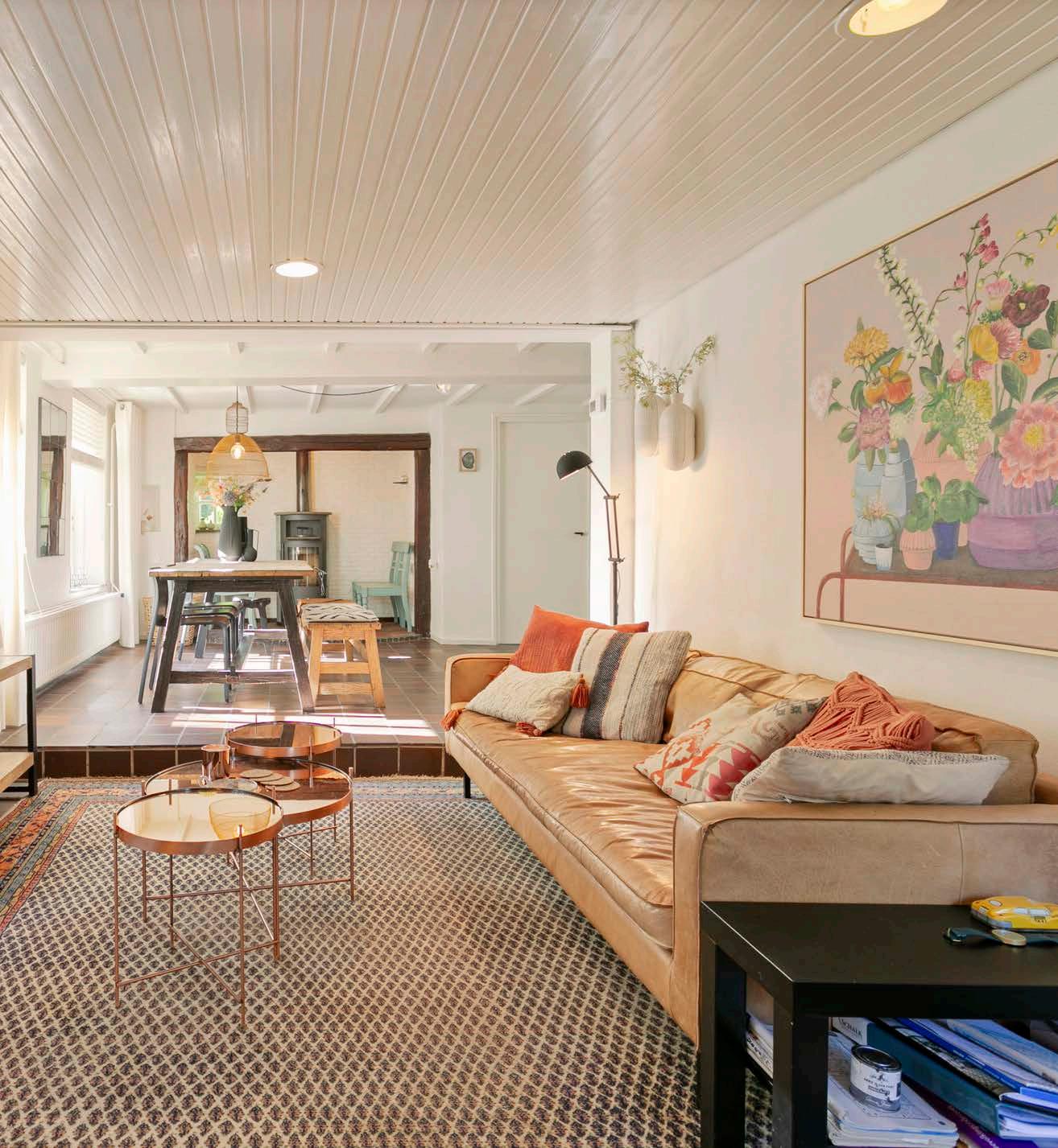 Kom binnen via de hal aan de zijkant van de woning. Hier bevind zich het toilet met fonteintje en de meterkast en de entree naar de woonkamer. De sfeervolle ruimte is verdeeld in een zitgedeelte en een hoger gelegen eetgedeelte, die het hart van het huis vormt en waar ruimte is voor een lekker grote eettafel. Bij de nieuw geplaatste speksteenkachel is het heerlijk zitten in de winter. De living ligt net iets lager. Ook hier is ruimte genoeg voor een gezellige zithoek, heb je vrij uitzicht en een tweede houtgestookte haard. De ruimte wordt tevens verwarmd en gekoeld door middel van een in 2023 geplaatste airconditioning.