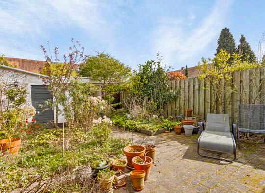 De tuin is georiënteerd op het oosten en vangt daardoor de ochtendzon. Het is een onderhoudsvriendelijke buitenruimte met vaste beplanting en een grote stenen berging, ideaal voor het opslaan van fietsen en tuingereedschap.