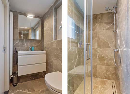 Op de eerste verdieping vind je drie slaapkamers, elk met voldoende licht en ruimte. De badkamer is modern ingericht met grijstinten en beschikt over een wastafelmeubel met opbergruimte, een zwevend toilet en een inloopdouche. Een raam zorgt voor natuurlijk licht en ventilatie.