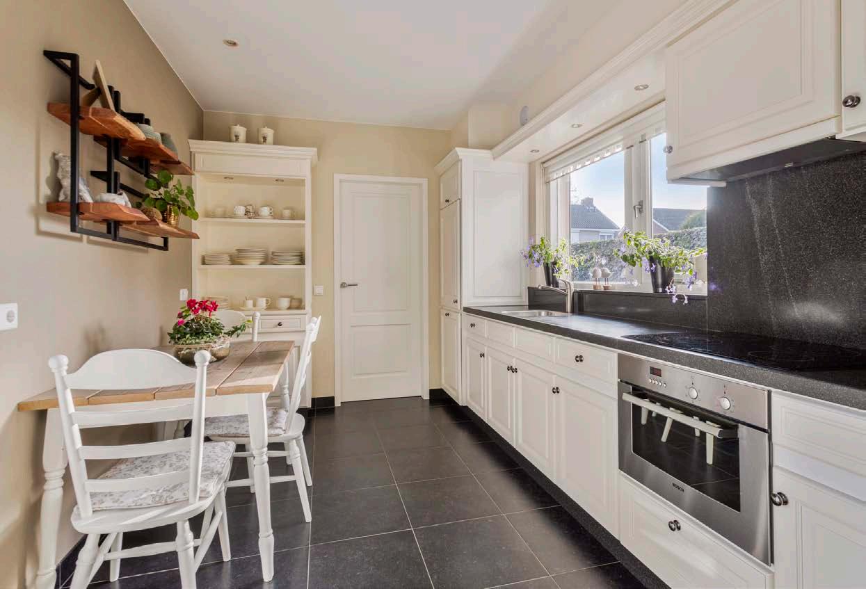 De aangebouwde keuken is een droom voor iedereen die van koken houdt, met voldoende ruimte voor al je culinaire avonturen. Een handige bijkeuken biedt extra opslagruimte en functionaliteit. Vanuit de bijkeuken bereik je ook de praktische en lekker grote provisiekelder.