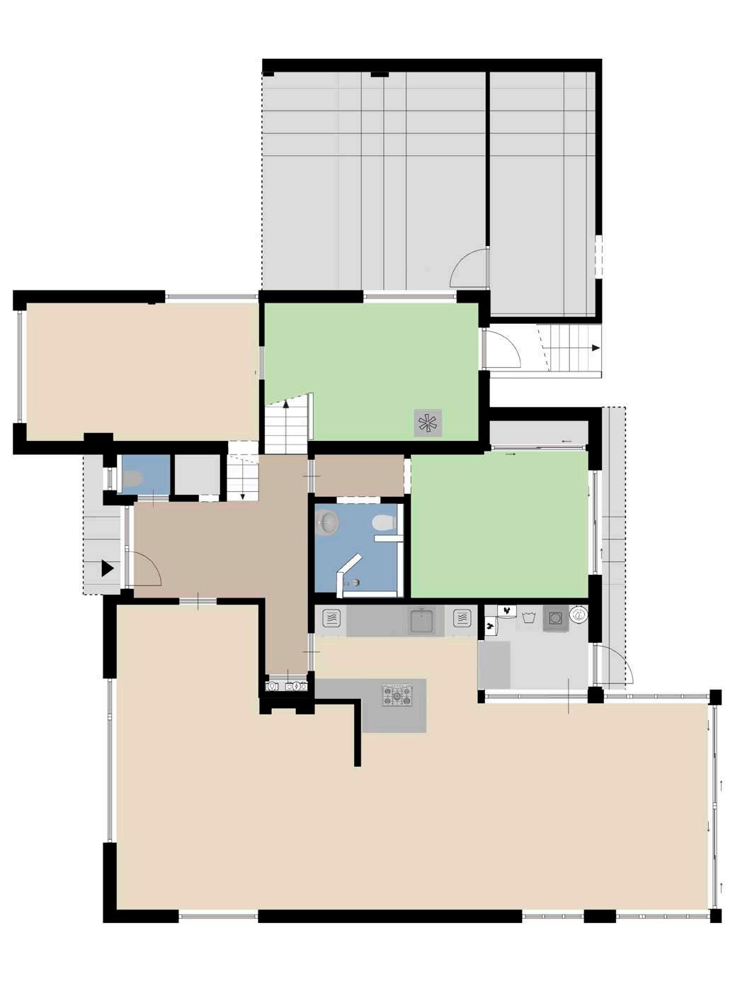 Laat je verrassen door het moderne en open interieur dat schuilgaat achter de bescheiden voorgevel. Zodra je binnenstapt, word je verwelkomd door een zee van licht dankzij de grote ramen en slimme architectonische keuzes. Het design is een perfecte mix van stijl en functionaliteit, waardoor elke ruimte een uitnodigende sfeer heeft.