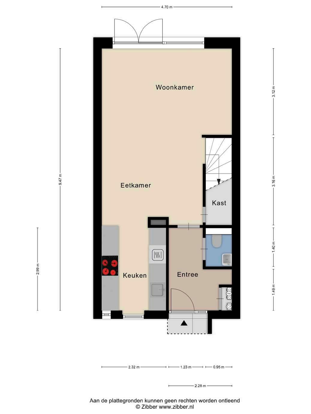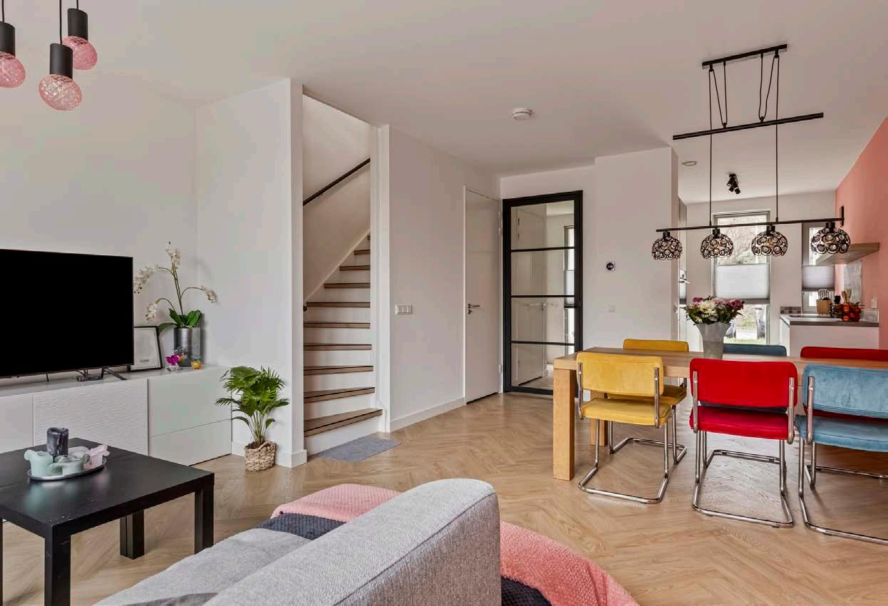 Bij binnenkomst verwelkomt een ruime hal je met een moderne pvc-vloer in een elegant visgraatmotief, die naadloos doorloopt over de gehele begane grond en is voorzien van vloerverwarming. Hier vind je ook een meterkast en een modern toilet met fonteintje, ideaal voor gasten. De woonkamer is een lichte, uitnodigende ruimte dankzij de tuingerichte opzet en dubbele tuindeuren die een directe verbinding met de tuin geven. De diepe trapkast biedt praktische opbergruimte.