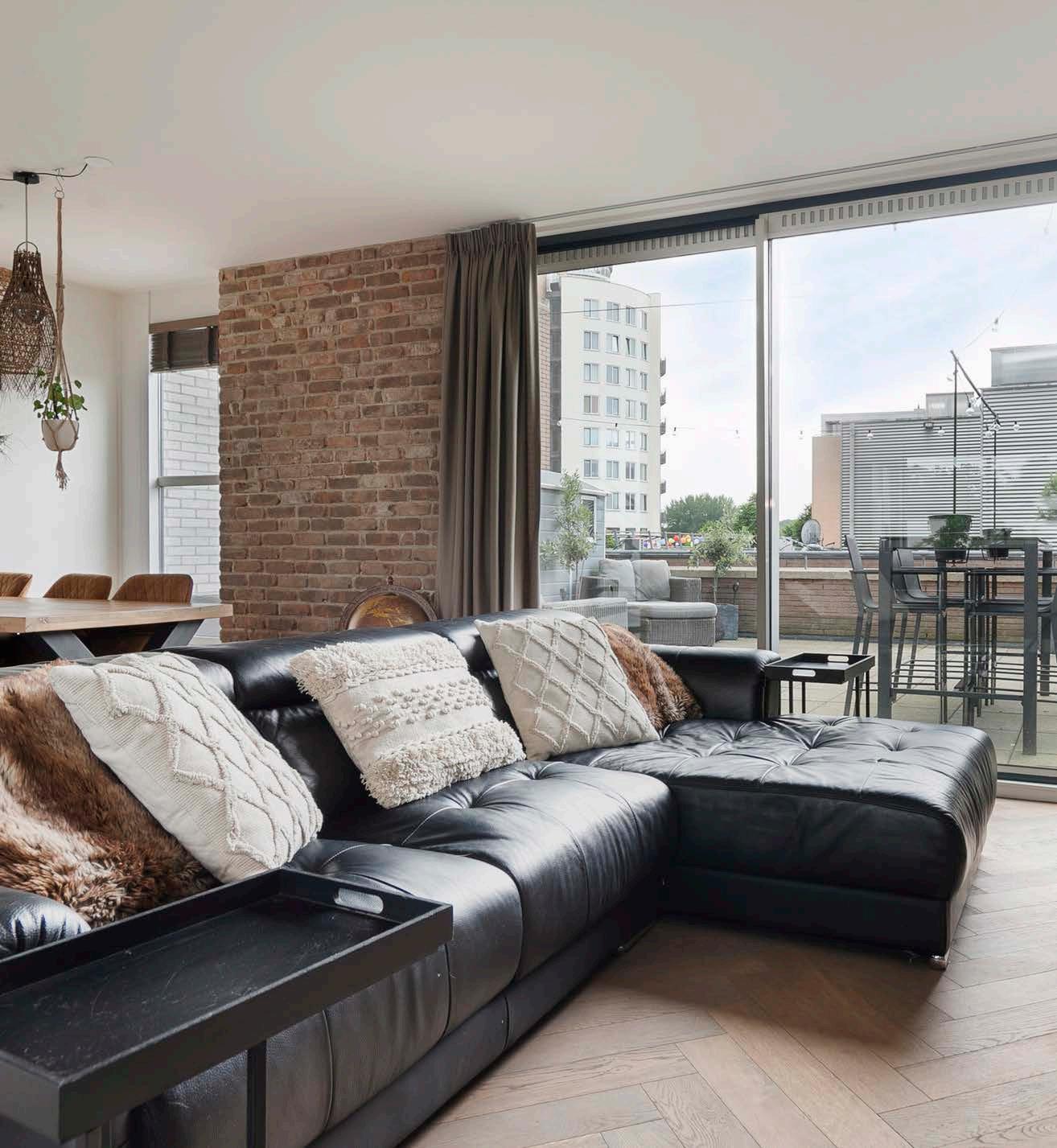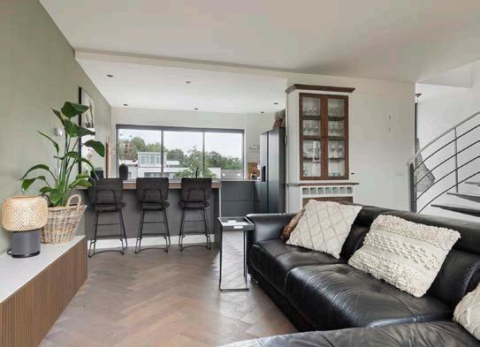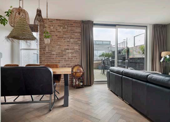 De ruime woonkamer, met veel lichtinval en een schuifpui, zorgt voor een open verbinding met het grote en zonnige dakterras.