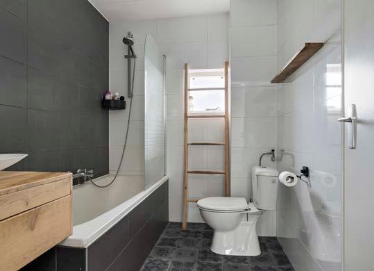De badkamer is voorzien van een douche in bad, een wastafelmeubel en toilet. Het is een functionele ruimte met een eigentijdse uitstraling die aansluit bij de rest van het appartement.