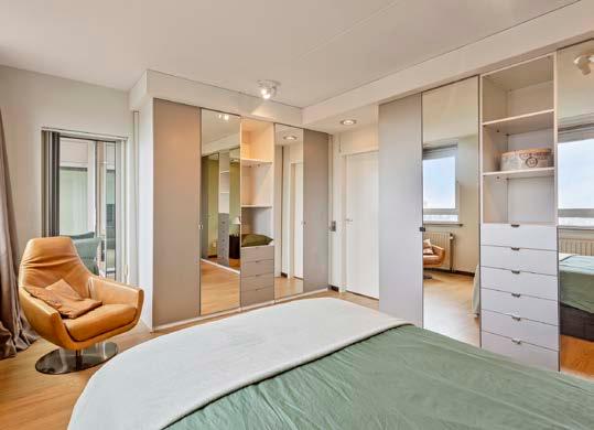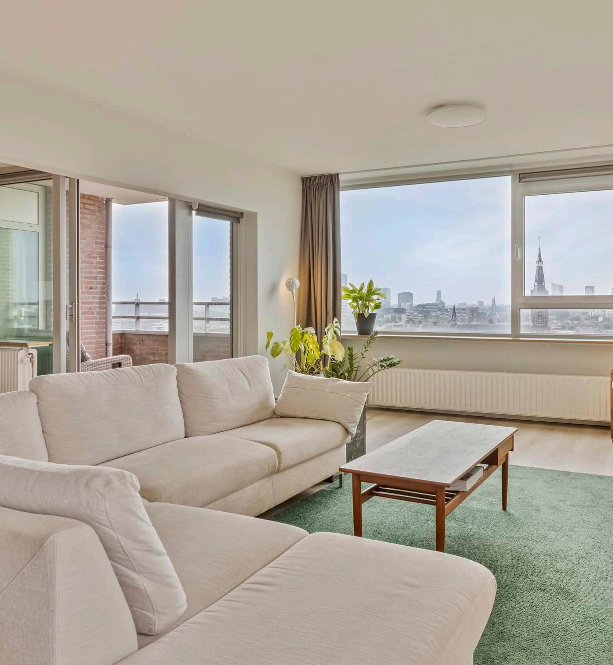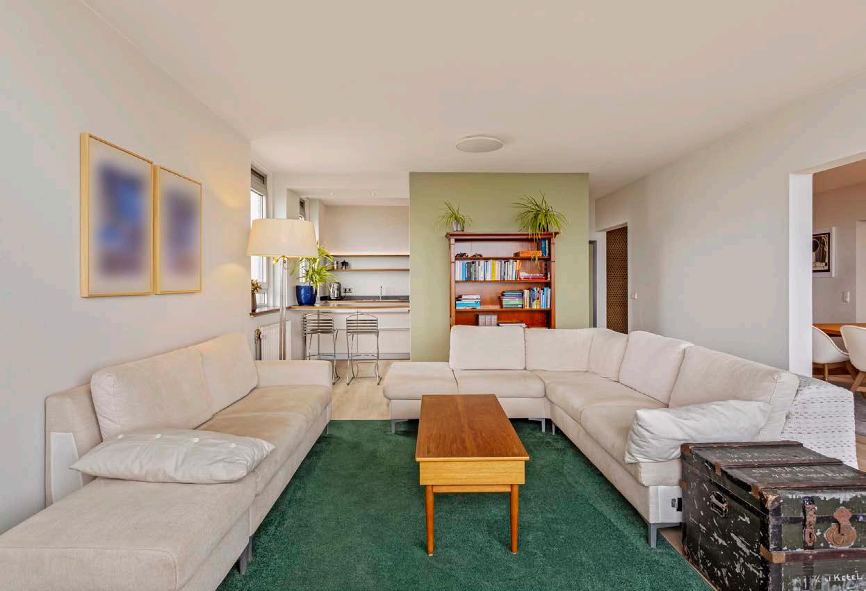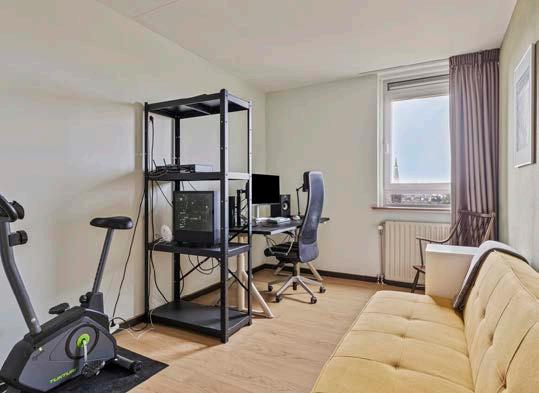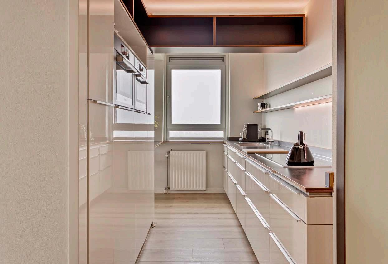 De woonkamer is licht en ruim, voorzien van een eetgedeelte en een praktische werkhoek. Dankzij de grote schuifpui heb je toegang tot de loggia, waar je kunt genieten van een panoramisch uitzicht over de stad.