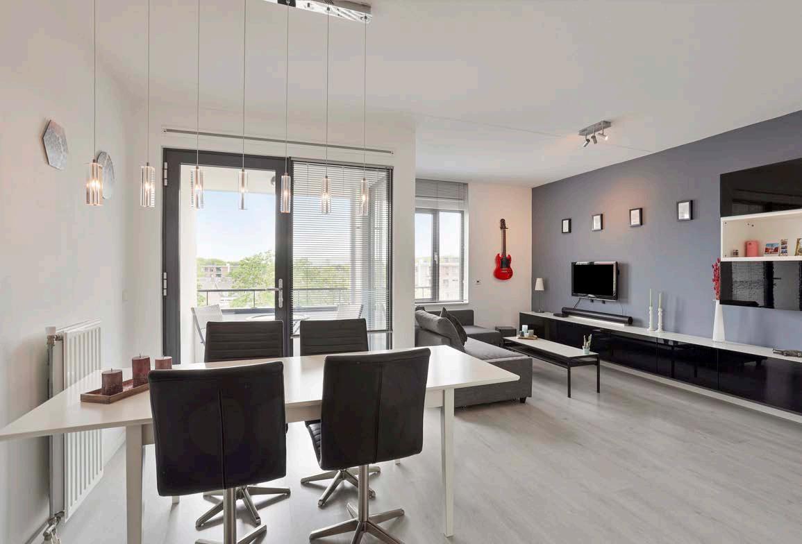 Aan de voorzijde van het appartement is de slaapkamer gelegen. Ook hier kun je een verzorgde afwerking verwachten met eveneens grote ramen. De bar bij het raam zorgt voor een speels effect in de slaapkamer en heeft meerdere functies.