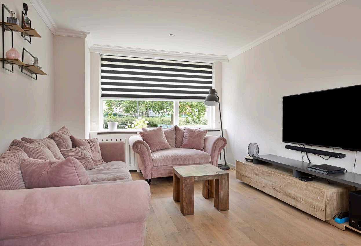 De woonkamer is heerlijk licht dankzij grote ramen aan de voorzijde en openslaande deuren aan de achterzijde. Deze lichte en luchtige ruimte biedt voldoende mogelijkheden voor het creëren van een gezellige zithoek en een comfortabele eethoek. De keurige houten vloer draagt bij aan de warme uitstraling van de ruimte.