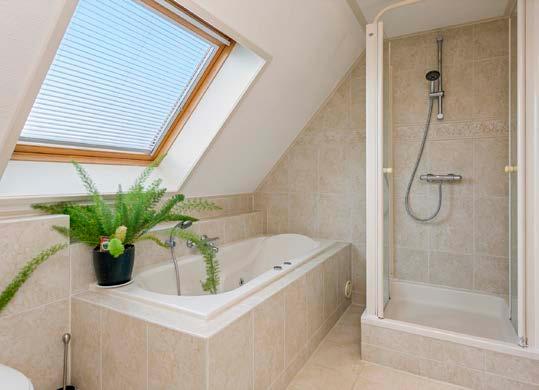 Via de overloop op de eerste verdieping kom je in de badkamer die alle mogelijke comfort biedt en compleet is uitgerust met een ligbad met whirlpool, separate douchecabine met thermostaatkraan en handdouche, wastafel met ombouw, een zwevend toilet en een designradiator.