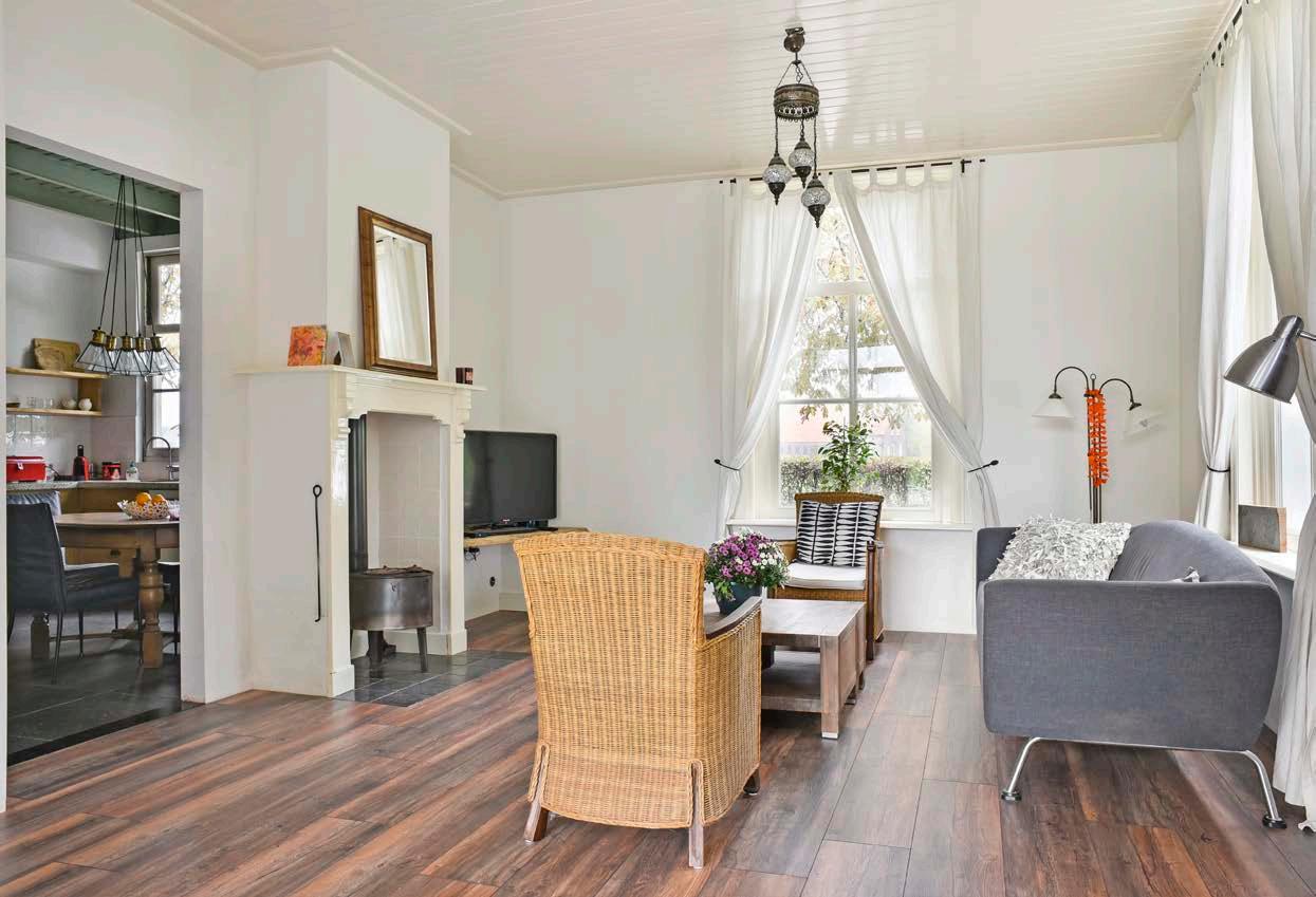 Woongedeelte zuidzijde De royale woonkamer op de oude deel is authen tiek afgewerkt en volledig naar eigen wens in te richten. De ruimte heeft veel potentie en de moge lijkheden zijn eindeloos! Doordat de grote staldeuren zijn vervangen door glaspuien is de lichtinval uitste kend. Daarnaast zijn alle originele stalen stalramen gerestaureerd en geschikt gemaakt voor voorzet ramen. De trekbalken van de kapconstructie en de bijbehorende rondhouten staanders geven de ruimte een stoere uitstraling. De eikenhouten vloer met vloerverwarming verhoogt de warme sfeer die je direct voelt als je binnenkomt.