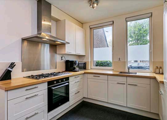 Vanuit de hal heb je toegang tot de moderne keuken, gelegen aan de voorzijde van de woning. De keuken is voorzien van het nodige kookcomfort, te noemen: een 5-pits gaskookplaat, afzuigkap, koelkast, vriezer, vaatwasser en een oven. Uiteraard heb je in de keuken de ruimte om een gezellige eethoek te plaatsen.