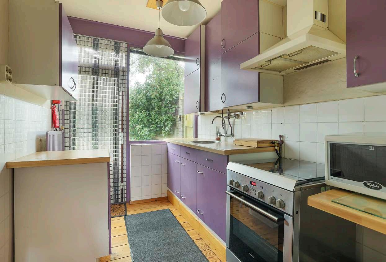 De dichte keuken is momenteel voorzien van losse keukenapparatuur. Daarnaast biedt het voldoende kastruimte voor alle keukenbenodigdheden en boodschappen. Middels de achterdeur verkrijg je toegang tot de achtertuin. Door het brede perceel is wellicht een (zij)uitbouw een mogelijkheid voor een kookeiland! Laat je fantasie de vrije loop, hoe komt jouw droomkeuken er uit te zien?