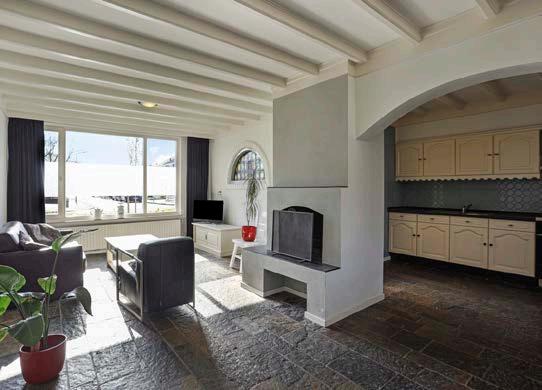 De woonkamer heeft een speelse indeling met een zitgedeelte aan de voorzijde en een werk-/hobbyruimte aan de achterzijde. De ruimte is afgewerkt met een tegelvloer en de wanden zijn afgewerkt met granol stucwerk. Het daglicht valt optimaal naar binnen via het grote raam aan de voor- en achterzijde en via de lichtkoepels.