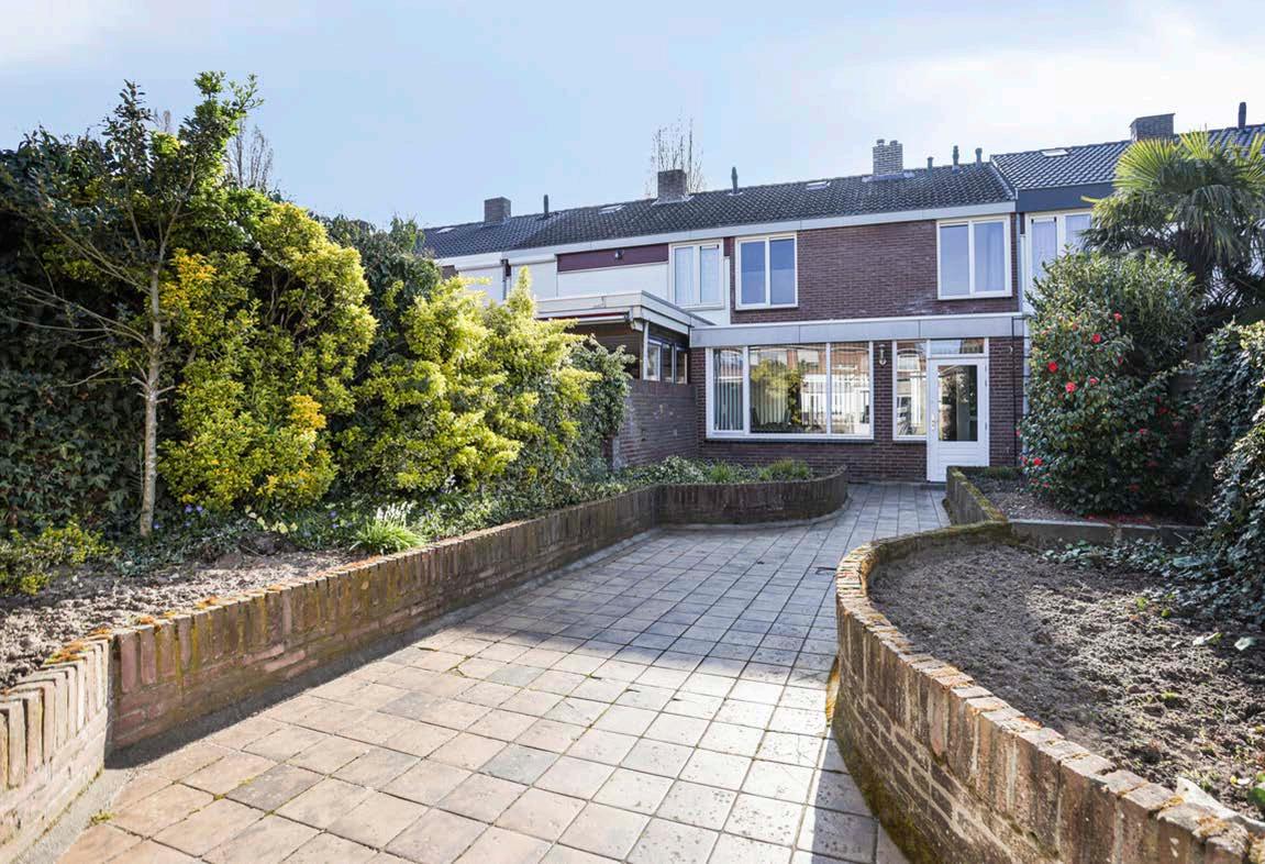 De diepe tuin ligt op het westen en is verzorgd aangelegd. De tuin is grotendeels bestraat en voorzien van ruime borders gevuld met vaste beplanting. Achter in de tuin staat een berging en heb je toegang tot de tuin via de eigen achterom.