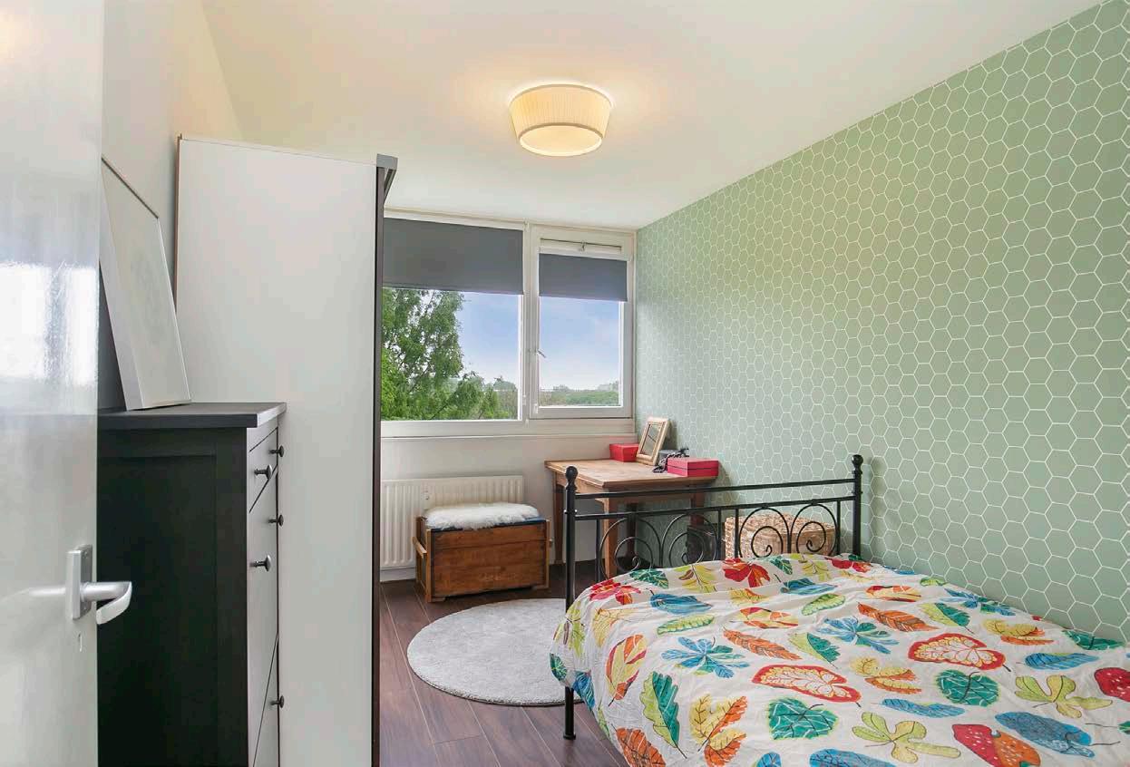 De slaapkamer is met een oppervlakte van bijna 12m2 plezierig ruim en biedt voldoende ruimte voor een goed formaat bed en een kledingkast. Ook deze ruimte is lekker licht en verzorgd afgewerkt met dezelfde vloer als de voorgaande vertrekken.