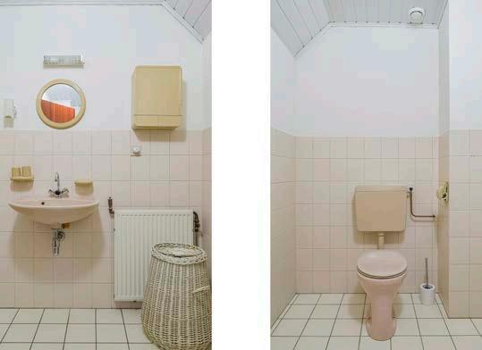 Tot slot is de tweede badkamer volledig betegeld en voorzien van een toilet en een wastafel.