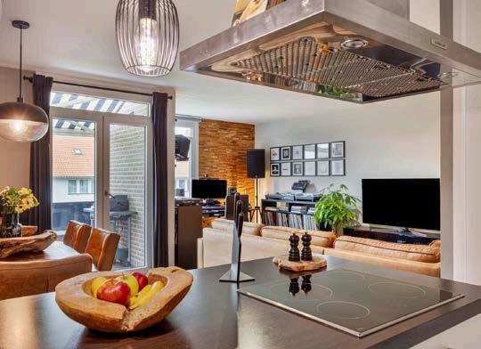 De open keuken maakt de woonkamer compleet en is uitgerust met hoogwaardige inbouwapparatuur. Het beschikt over een vaatwasmachine, spoelbak, inductiekookplaat, combi oven/magnetron, afzuigkap en een inbouwkoelkast. Deze moderne keuken biedt voldoende ruimte en gemak voor zowel dagelijks koken als het entertainen van gasten. De bijkeuken, gelegen tussen de woonkamer en de slaapkamer, fungeert momenteel als een praktische walk-in closet, maar kan ook dienst doen als extra opbergruimte.