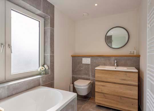 De ruime badkamer heeft een luxe uitstraling en is voorzien van een toilet, wastafelmeubel, elektrische vloerverwarming en een ligbad. Hier kom je helemaal tot rust na een lange werkdag!