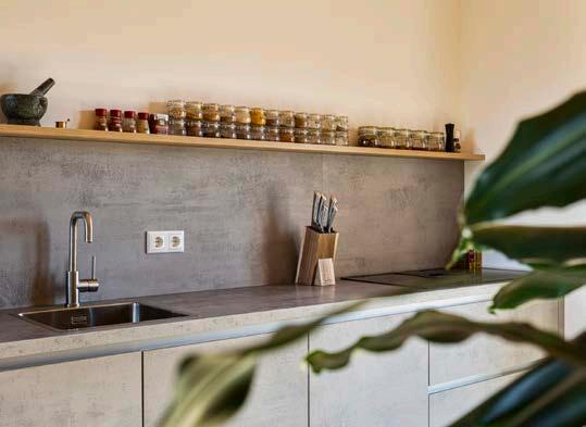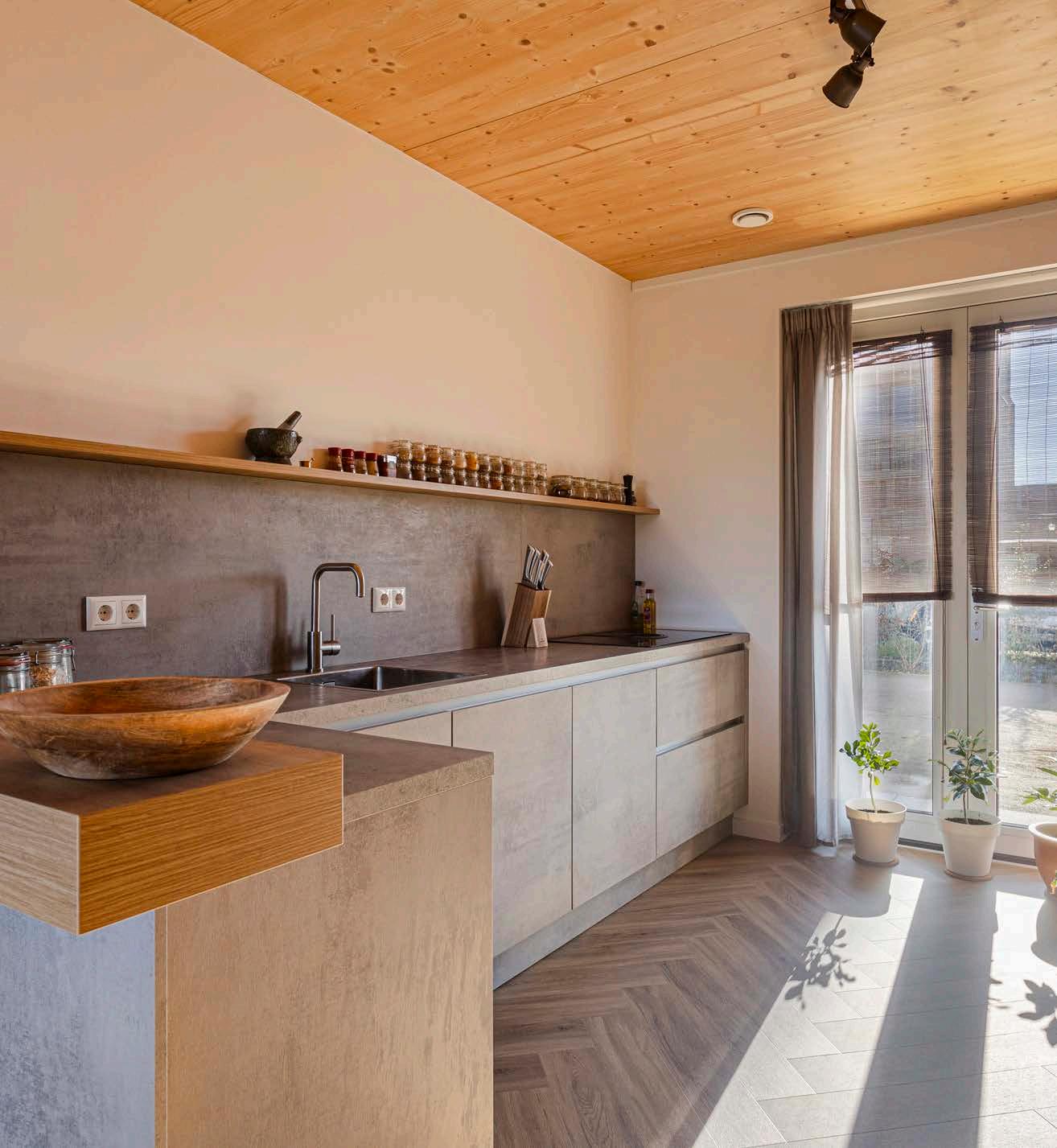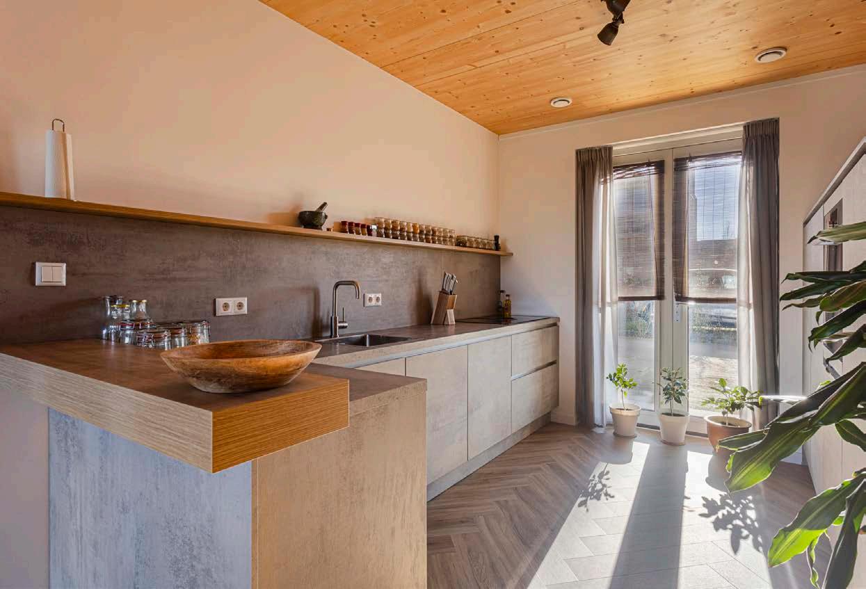 De open keuken bevindt zich aan de voorzijde van de woning. De L-vormige opstelling én de separate apparatenwand zijn voorzien van: een riant aanrechtblad, inductiekookplaat met directe afzuiging, een oven, vaatwasser, spoelbak met designkraan, koelkast, separate vriezer (5 laden) en voldoende kastruimte (o.a. een draaicarrousel.