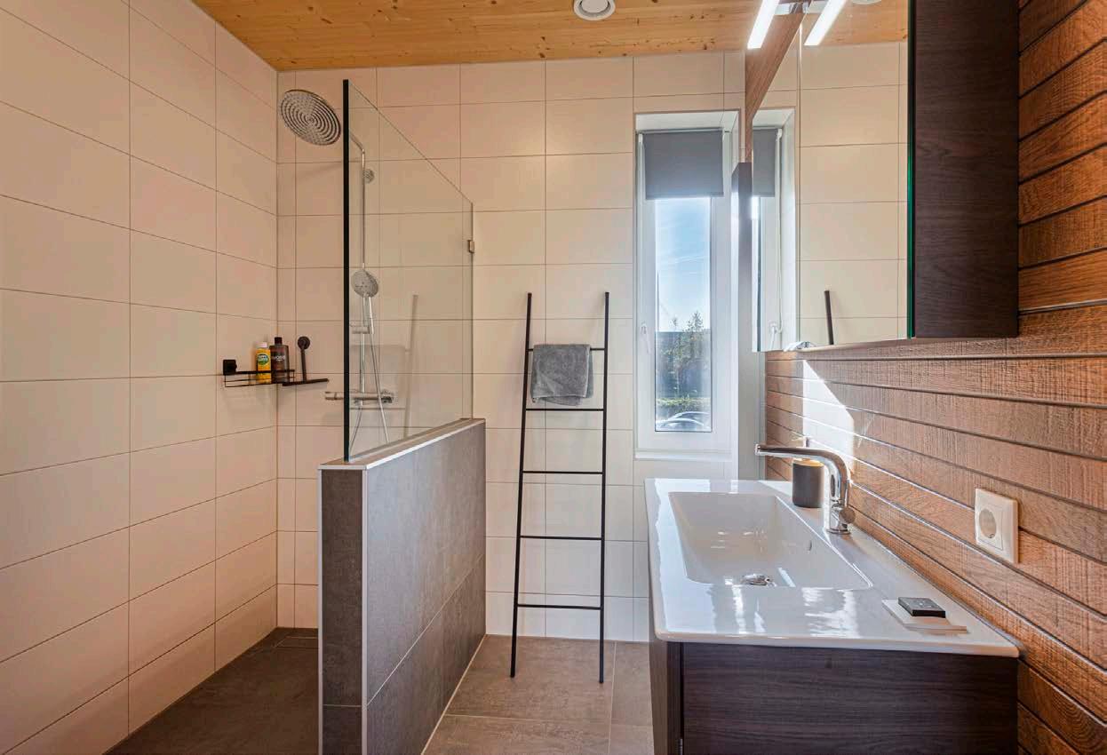 Een luxe badkamer met inloopdouche voor zien van v.v. thermostaatkraan en drainagegoot, wastafel in meubel, tweede toilet, natuurlijke- en mechanische ventilatie en een designradiator.