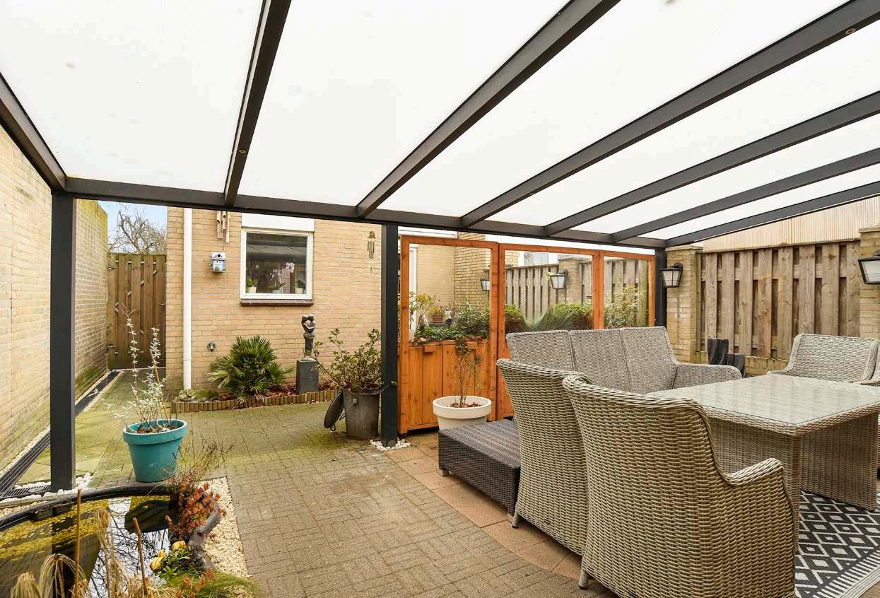 In de betegelde tuin op het oosten kun je lekker beschut onder de overkapping zitten. Zo geniet je het hele jaar rond van het buitenleven.