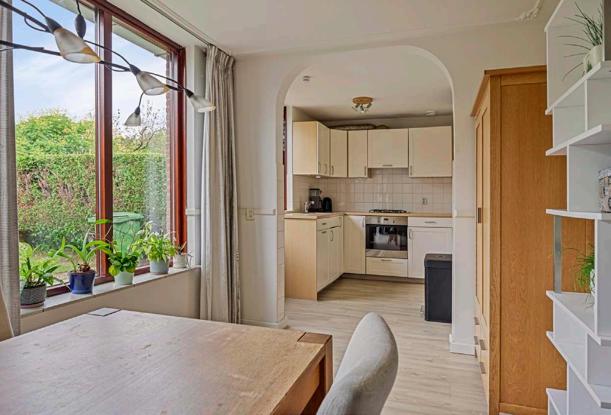 Het eetgedeelte staat in verbinding met de half open keuken. Hier vind je een nette keuken geplaatst in een hoekopstelling, waarbij je voldoende kast- en werkruimte tot je beschikking hebt. Daarnaast ben je hier voorzien van de nodige inbouwapparatuur.