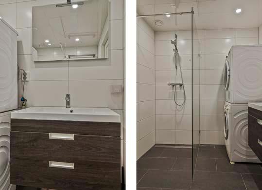 De badkamer is voorzien van een modern wastafelmeubel en een inloopdouche. Met aansluitingen voor wasmachine en droger is de badkamer zowel functioneel als stijlvol ingericht, wat dagelijkse routines vergemakkelijkt.