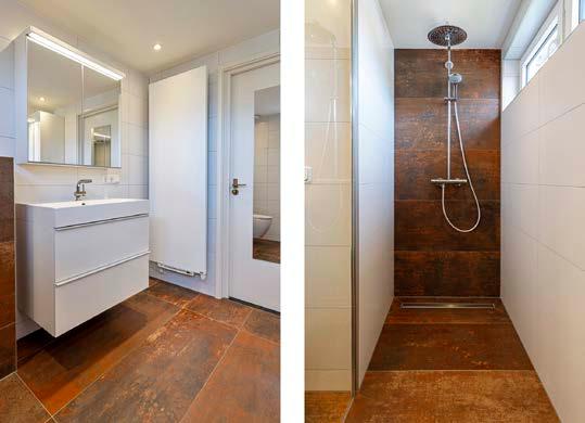 De badkamer is van alle luxe gemakken voorzien met een inloopdouche, wastafel en toilet. De ruimte is volledig betegeld en door de twee hoge ramen valt het nodige daglicht aangenaam naar binnen.
