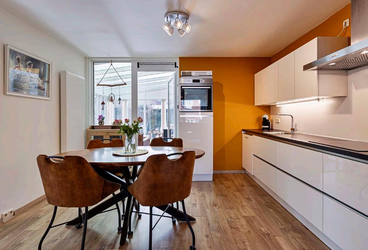 Via de openslaande tussendeuren stap je de woonkeuken in. Ideaal, want zo kun je deze twee ruimtes met elkaar verbinden of afsluiten. De strakke witte woonkeuken is van alle gemakken voorzien, zoals een inductiekookplaat, afzuigkap, oven, koelkast en een vaatwasser. De keuken is geplaatst in een rechte wandopstelling waardoor er nog alle ruimte is voor een gezellige eettafel.