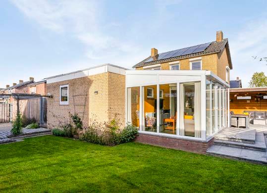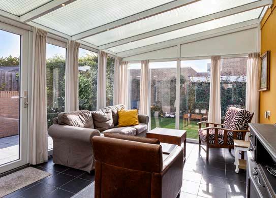 Achter de keuken is een mooie serre met veel ramen, waar je kunt ontspannen en genieten van het groen in de tuin.
