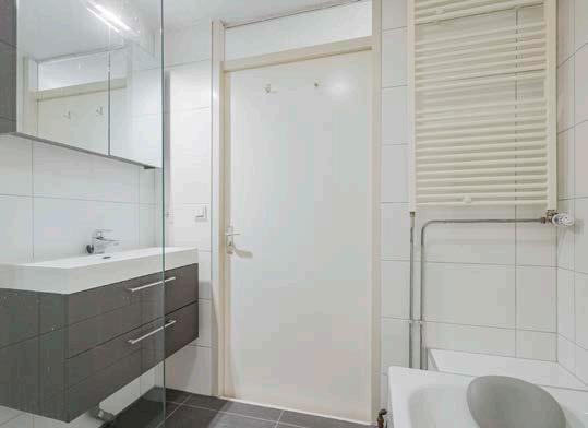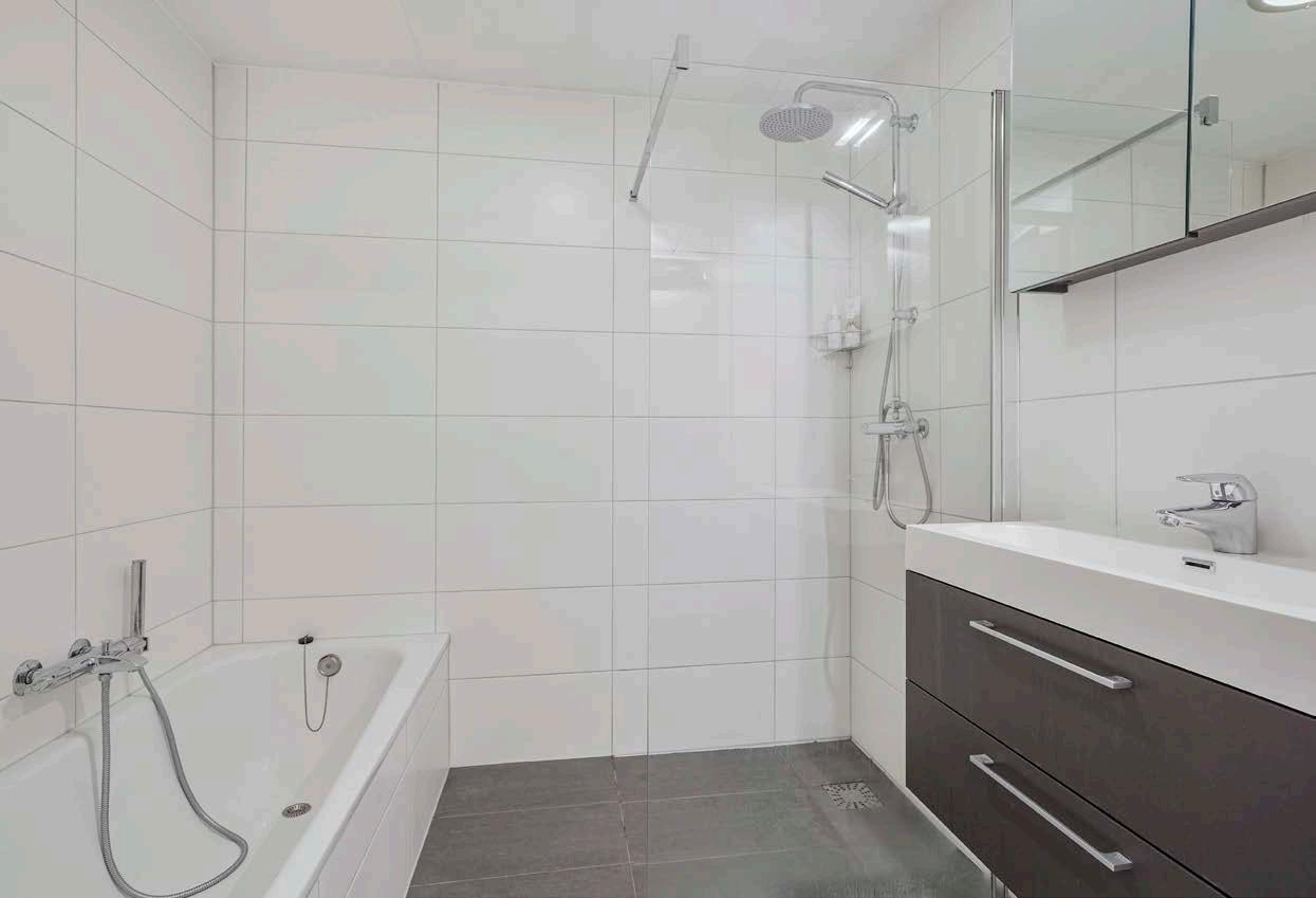 Kom verder naar de nette badkamer. De ruimte is volledig betegeld en compleet ingericht met een ligbad, douche en een wastafelmeubel. Tegenover de badkamer bevindt zich een aparte toiletruimte.