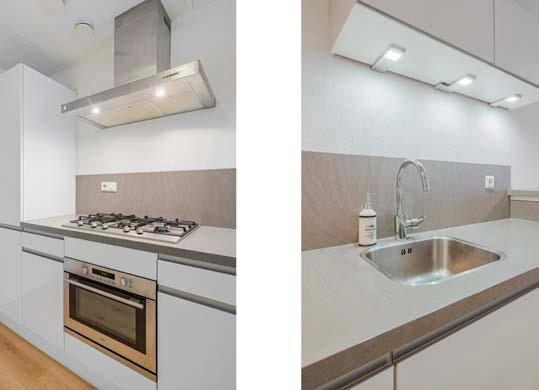 De nette keuken (2012) is geplaatst in een dubbele, rechte wandopstelling en is voorzien van diverse inbouwapparatuur. Ook hier is gekozen voor een lichte afwerking met witte keukenfronten en een bijpassend aanrechtblad.