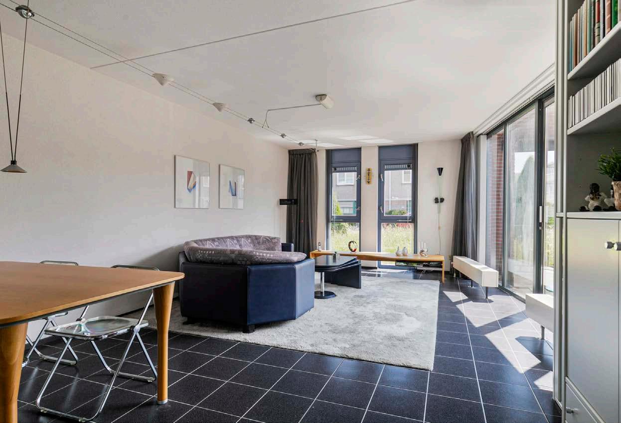 De ruime woonkamer heeft een heerlijke hoeveelheid lichtinval door de grote raampartijen. Er is voldoende plek voor een gezellige zithoek en een eettafel.