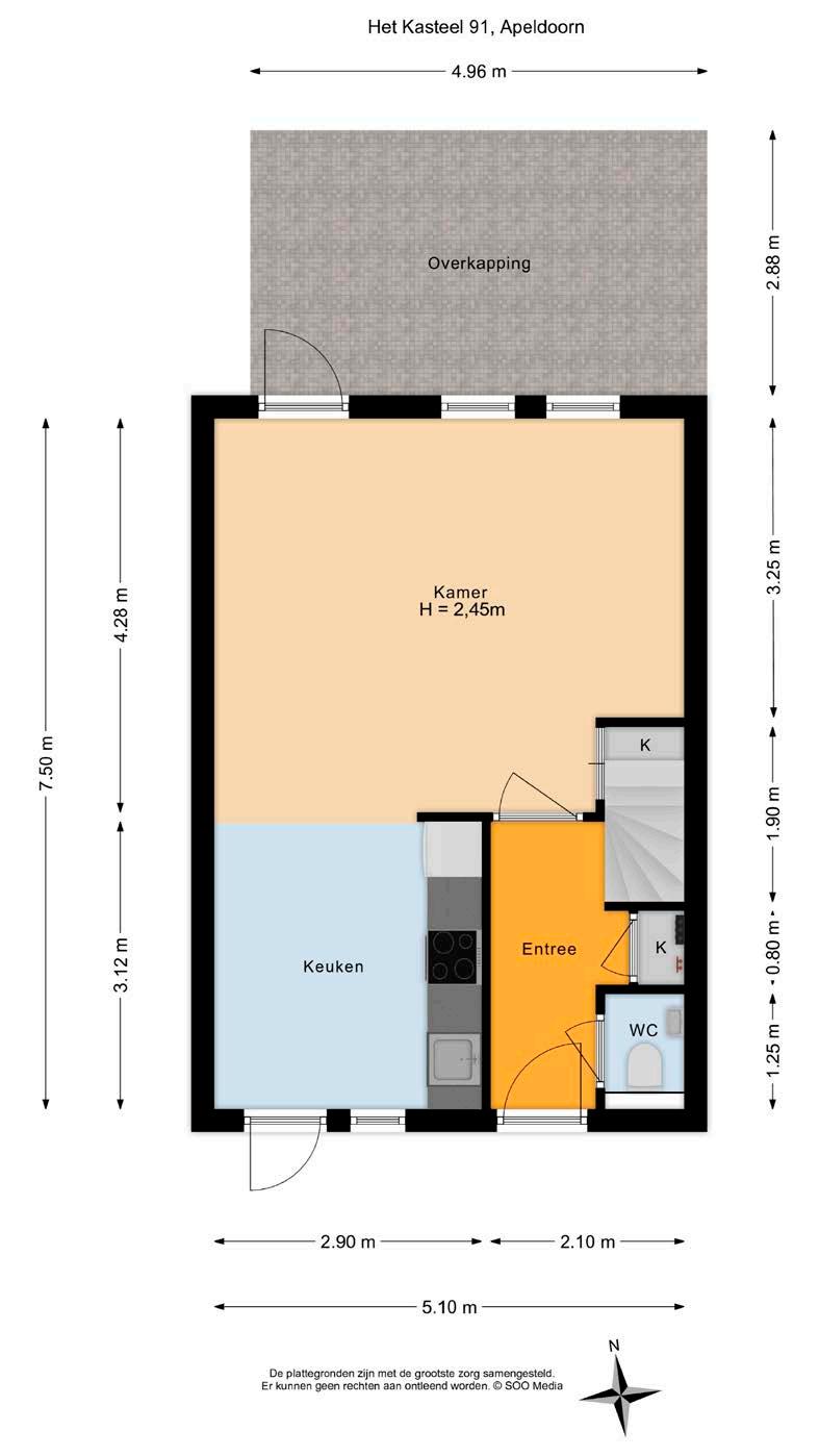 Middels de voortuin stappen we de woning binnen. Achter de deur schuilt de hal met de meterkast, het toilet, de trapopgang naar de eerste verdieping, en er is voldoende ruimte voor een garderobe. Hang je jas op en kom verder naar de woonkamer.