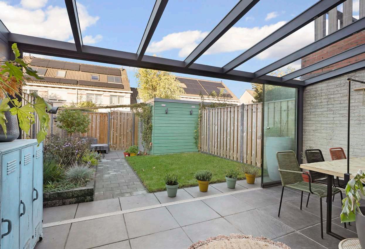Vanuit de woonkamer heb je toegang tot de fijne tuinkamer en de achtertuin op het noorden, waar je dus de hele dag heerlijk kunt genieten. De tuin is fraai aangelegd met een mix van betegeling en een gazon. Achterin de tuin is nog een terras ge plaatst, naast de houten berging die voorzien is van elektra.