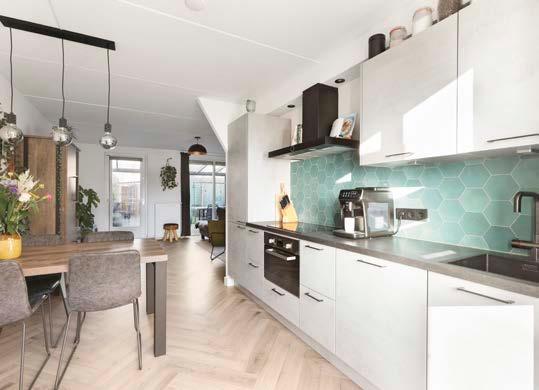 Deze gezellige eethoek sluit naadloos aan op de open keuken, waardoor de gezelligheid die zich aan de eettafel afspeelt nooit ver weg is als je staat te koken. De keuken is geplaatst in een wand opstelling en is voorzien van voldoende kast- en werkruimte. Uiteraard is gedacht aan het nodige kookcomfort, te noemen; een inductiekookplaat, afzuigkap, vaatwasser, koelkast, kokendwaterkraan en oven. Ook deze ruimte is heel licht door de raampartijen.